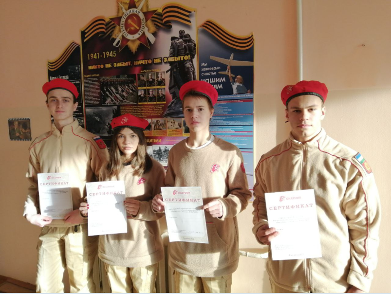 9 декабря 2021 г. на Аллее Героев состоялась торжественная церемония посвящения обучающихся в ряды Всероссийского детско-юношеского военно-патриотического общественного движения «ЮНАРМИЯ». 4 учащихся нашей школы были приняты в ряды юнармейцев. Ими стали ребята из 10-11 классов: Коровин Кирилл, Новикова Анастасия, Александров Борис, Кантимиров Динислам.